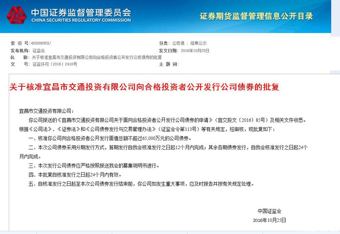 2016年10月25日,筆者從中國(guó)證券監(jiān)督管理委員會(huì)獲悉,根據(jù)中國(guó)證監(jiān)會(huì)證監(jiān)許可【2016】2410號(hào)《關(guān)于核準(zhǔn)宜昌市交通投資有限公司向合格投資者公開(kāi)發(fā)行公司債券的批復(fù)》文件,交投公...